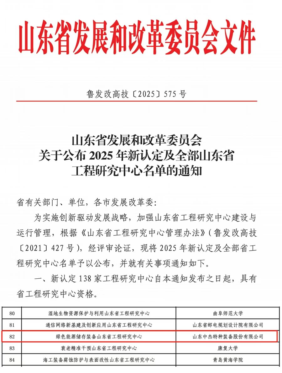 2025年8月,山東省發(fā)展和改革委員會發(fā)布《關(guān)于公布2025年新認(rèn)定及全部山東省工程研究中心名單的通知》(魯發(fā)改高技〔2025〕575號),依托公司牽頭建設(shè)的“綠色能源儲存裝備山東省工程研究中心”成功獲批。