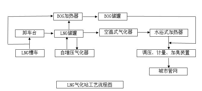 LNG由槽車運至LNG氣化站,利用LNG卸車增壓器使槽車內(nèi)壓力增高,將槽車內(nèi)LNG送至LNG低溫儲罐內(nèi)儲存。當(dāng)從LNG儲罐外排時,先通過儲罐的自增壓系統(tǒng),使儲罐壓力升高,然后打開儲罐液相出口閥,通過壓力差將儲罐內(nèi)的LNG送至氣化器后,經(jīng)調(diào)壓、計量、加臭等工序送入市政燃氣管網(wǎng)。當(dāng)室外環(huán)境溫度較低,空溫式氣化器出口的天然氣溫度低于5℃時,需在空溫式氣化器出口串聯(lián)水浴式加熱器,對氣化后的天然氣進行加熱。