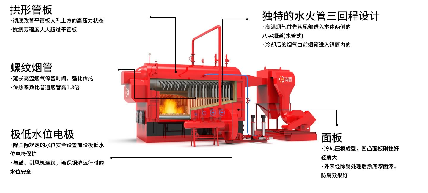 各規(guī)格鍋爐熱效率均>82%,高于國(guó)家標(biāo)準(zhǔn)要求。簡(jiǎn)化水循環(huán)回路后,減少了水循環(huán)流動(dòng)阻力,提高了上升管內(nèi)流速;對(duì)于熱水鍋爐在水循環(huán)流動(dòng)阻力較大的左、右水冷壁加裝回水引射裝置。提高了水循環(huán)的可靠性,保證鍋爐安全、穩(wěn)定運(yùn)行。 布置足夠的受熱面,使燃料燃燒放出的熱量能夠充分被受熱面吸收后傳遞給工作介質(zhì),排煙溫度低于160℃。合理布置前、后拱,提高爐膛溫度的同時(shí),加強(qiáng)煙氣在高溫區(qū)的擾動(dòng),減少了化學(xué)不完全燃燒損失和飛灰損失。